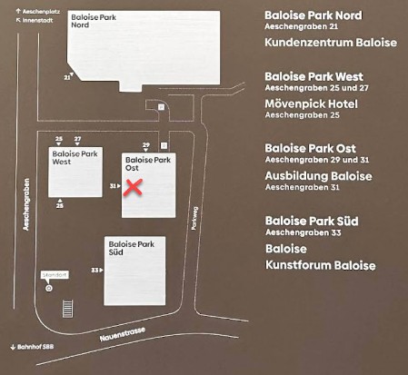 Wenn du vor dem Hauptgebäude (grau, mit den runden Fenstern) stehst, dann gehst du links zwischen dem Hotel Mövenpick und dem braunen Gebäude zum Eingang der Baloise.