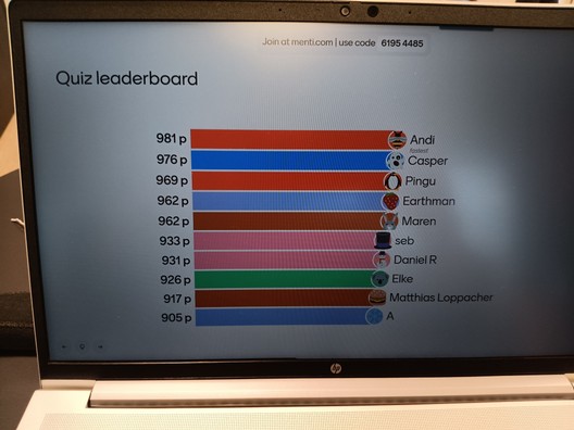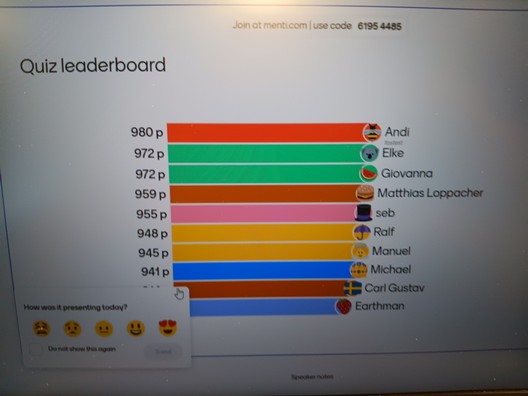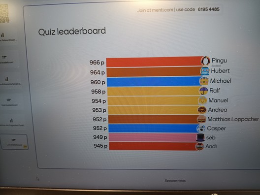 Im Anschluss führten die Moderatoren ein kleines Quiz mit 3 Fragen (und jeweiligen Antwortmöglichkeiten via Menti) durch. Die Person welche die richtige Antwort am schnellsten gab, wurde mit einem Buch belohnt.